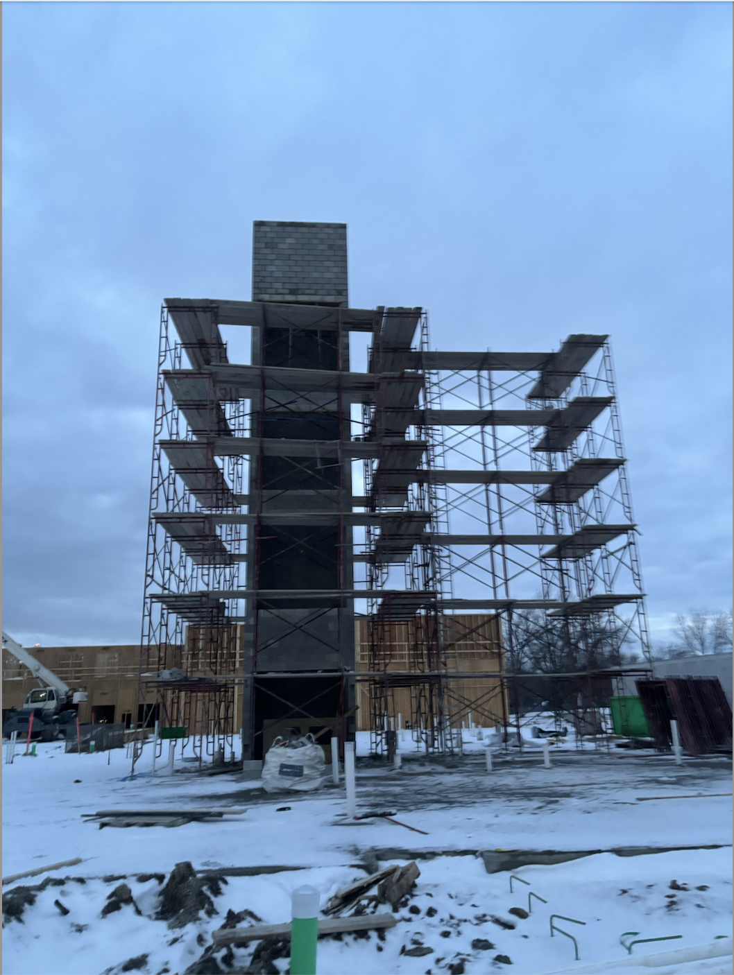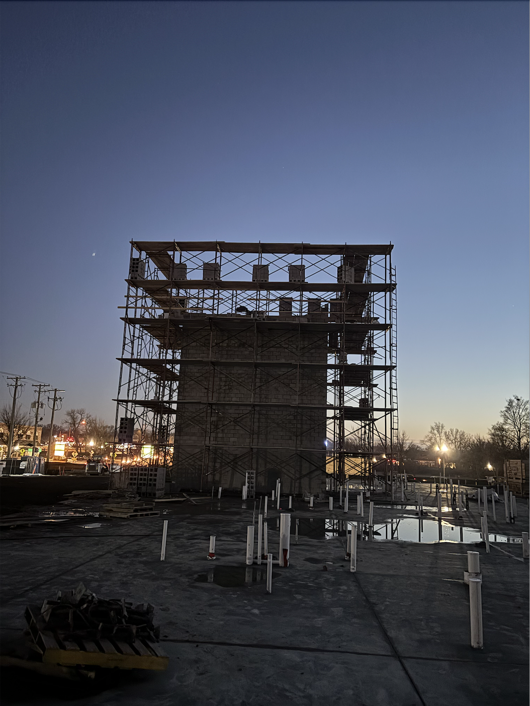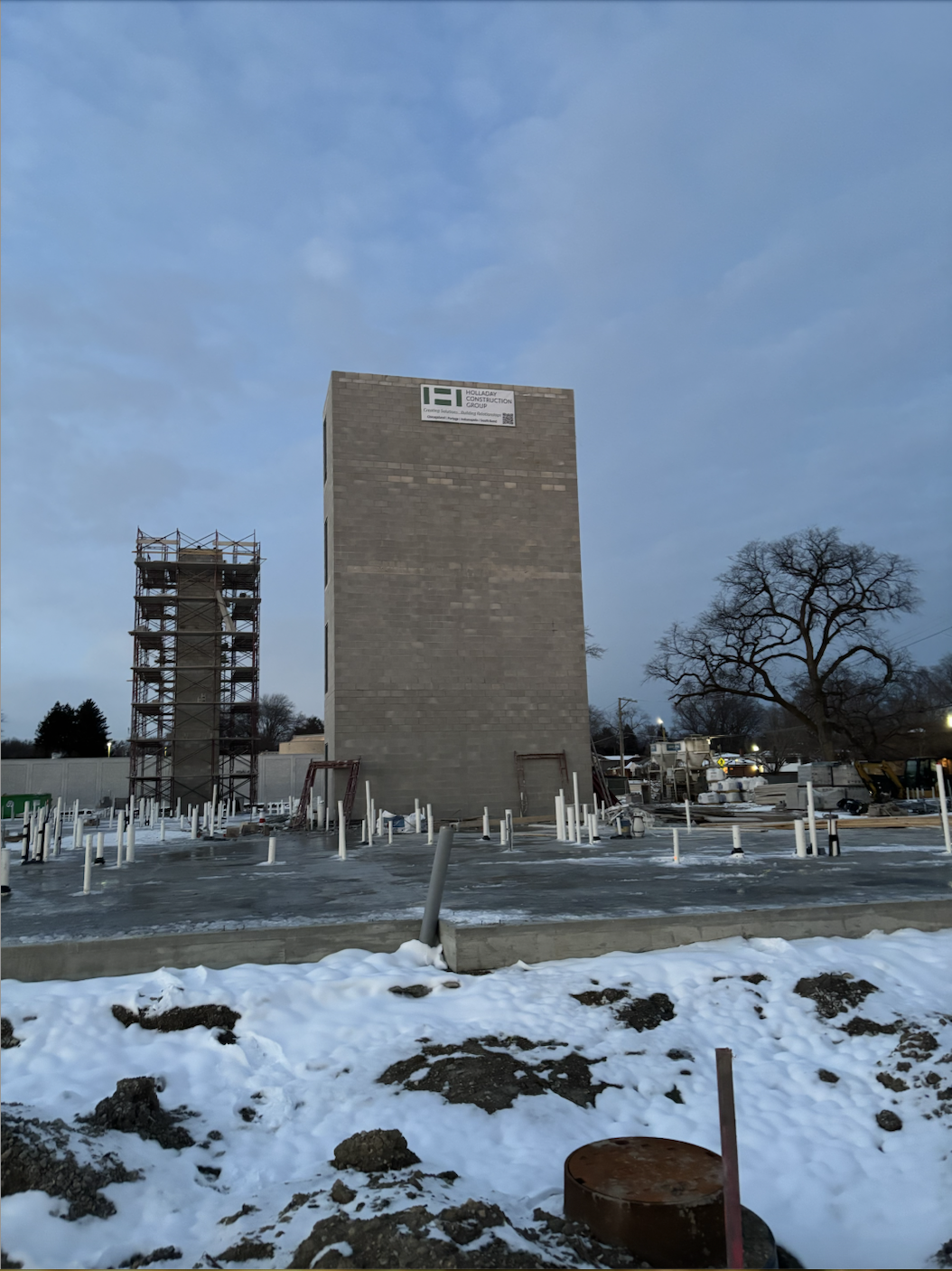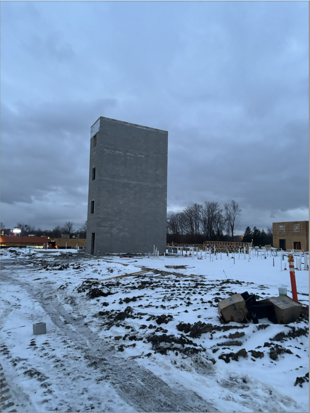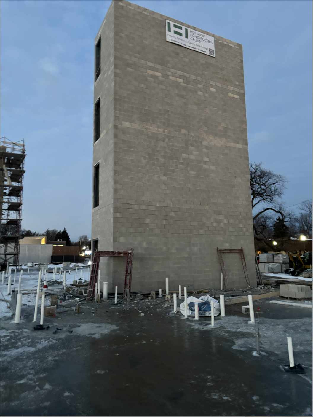 - Furnish and install 8” CMU necessary for erecting two (2) full height elevator shafts, two (2) full height stairwells as per drawings. Block is to be installed in standard running bond using natural gray type ‘S’ mortar. Mortar joints are to be tooled concave, brushed and tooled to a final finish.